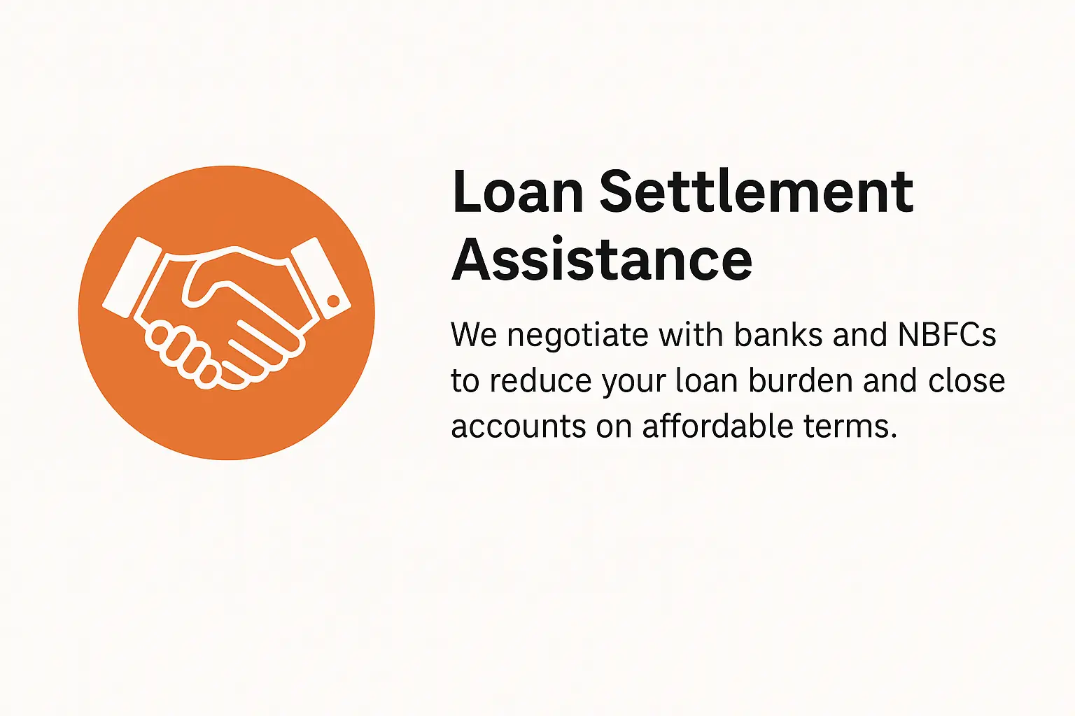 We negotiate with banks and NBFCs to reduce your loan burden and close accounts on affordable terms.